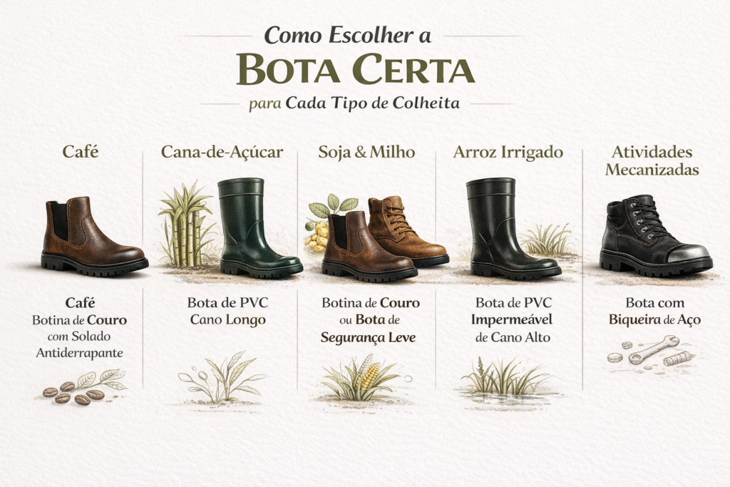 Se existe um item que define a jornada de um peão, é o calçado. Como os pés estão em contato direto com o solo, as botas para colheita são o ponto de contato direto com o solo, influenciando no seu equilíbrio e segurança enquanto oferecem suporte absoluto durante o dia todo.
